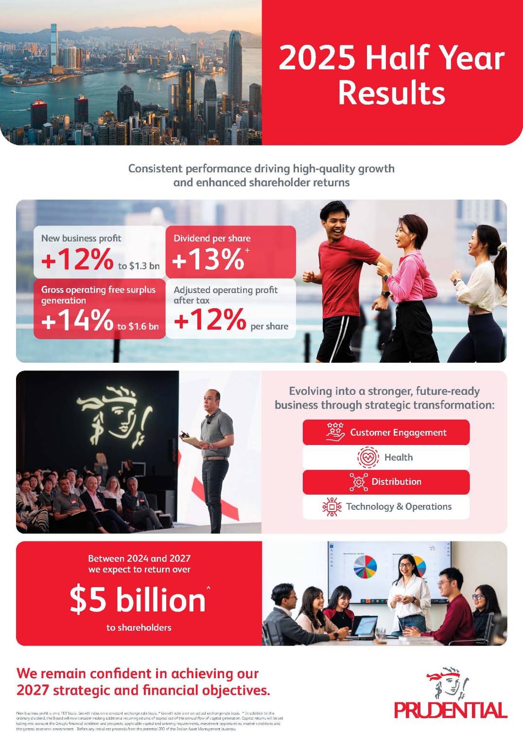 กลุ่มบริษัทพรูเด็นเชียล แถลงผลการดำเนินงานครึ่งปีแรก (สิ้นสุดวันที่ 30 มิ.ย. 68) รวมทั้งนำเสนอความคืบหน้าของแผนส่งมอบคุณค่าแก่ผู้ถือหุ้นอย่างต่อเนื่อง ภายใต้โครงการซื้อหุ้นคืนของบริษัทฯ สำหรับผลการดำเนินงานที่โดดเด่นในช่วงครึ่งปีแรกนั้น พรูเด็นเชียล มีผลกำไรธุรกิจใหม่ (New Business Profit) เติบโตเพิ่มขึ้น 12% เมื่อเทียบกับปีที่แล้ว อยู่ที่ 1260 ล้านดอลลาร์สหรัฐ (ตามวิธีการคำนวณแบบ Traditional Embedded Value -TEV) บริษัทฯ มีกระแสเงินสดส่วนเกินจากธุรกิจประกันชีวิตที่ยังมีผลบังคับ และธุรกิจการจัดการสินทรัพย์ เพิ่มขึ้น 14% คิดเป็นมูลค่า 1560ล้านดอลลาร์สหรัฐ