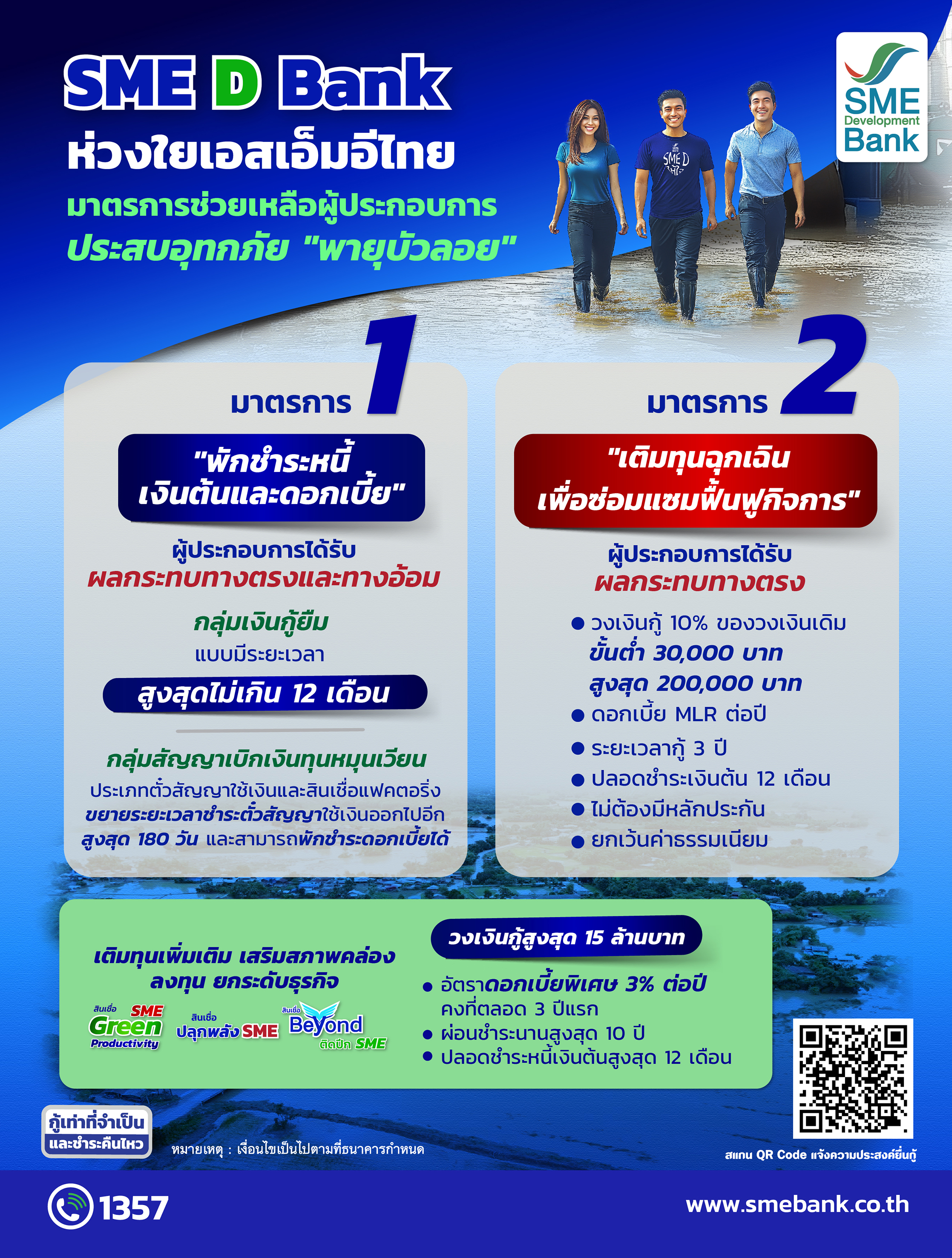SME D Bank ออกมาตรการเร่งด่วน ช่วยเหลือผู้ประกอบการเอสเอ็มอีได้รับผลกระทบจากอิทธิพลพายุ “บัวลอย”ในพื้นที่18 จังหวัด ตามรายงานกรมป้องกันและบรรเทาสาธารณภัยให้สิทธิ์พักชำระหนี้เงินต้นและดอกเบี้ยสูงสุดไม่เกิน 12 เดือนช่วยลดภาระทางการเงิน ควบคู่เติมทุนฉุกเฉิน ซ่อมแซมฟื้นฟูให้กิจการกลับมาเดินหน้าได้โดยเร็ว