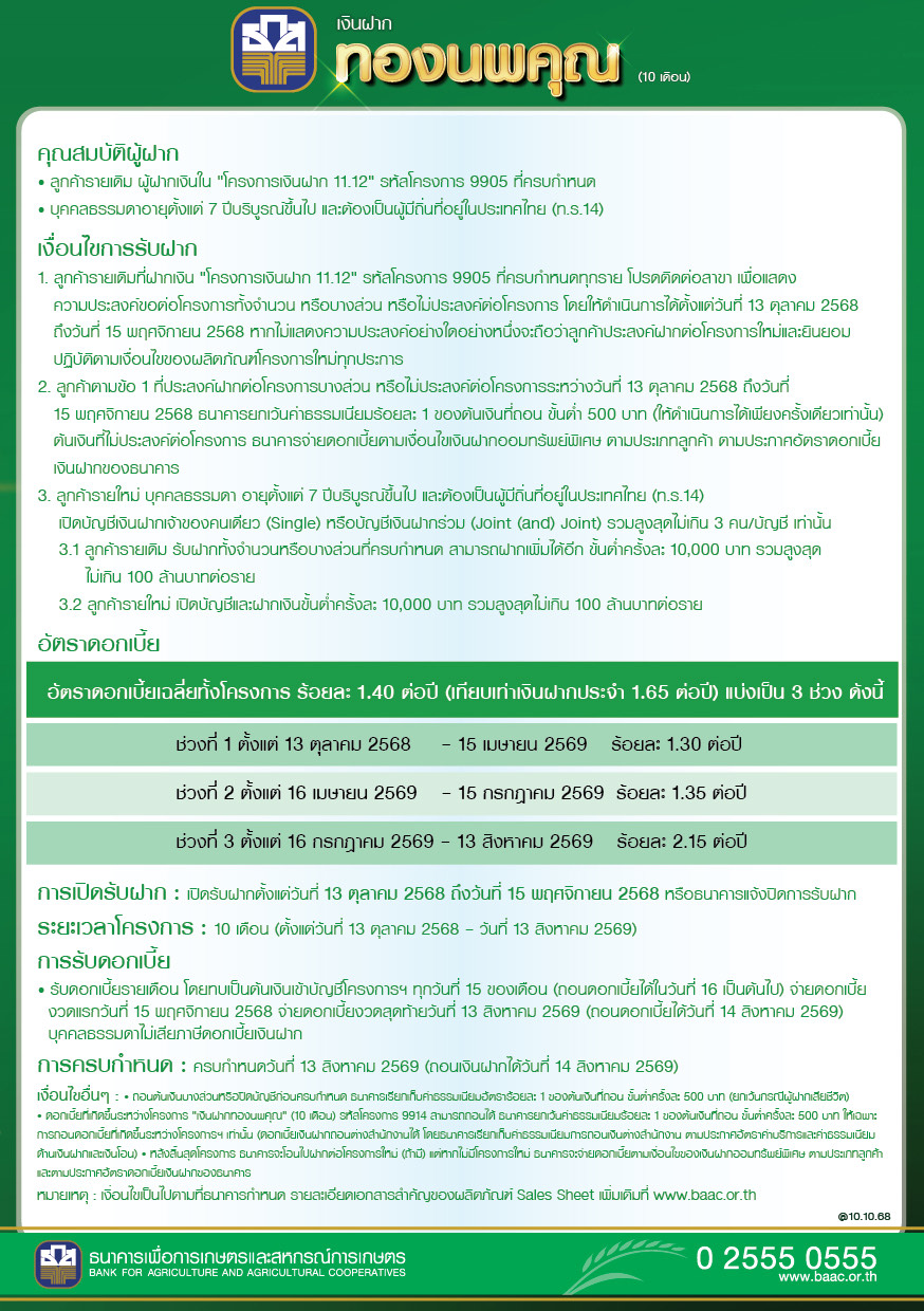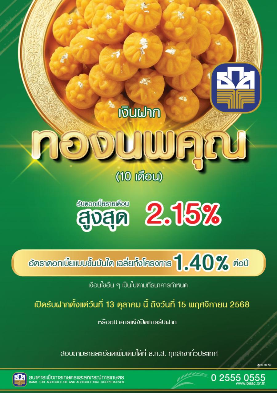 ธ.ก.ส. เปิดตัว ”เงินฝากทองนพคุณ” ฝากขั้นต่ำครั้งละ 10000 บาท วงเงินฝากรวมสูงสุดไม่เกิน 100 ล้านบาทต่อราย รับดอกเบี้ยทุกเดือนแบบขั้นบันได สูงสุดถึงร้อยละ 2.15 ต่อปี เฉลี่ยทั้งโครงการร้อยละ 1.40 ต่อปี ระยะเวลาฝาก 10 เดือน เปิดรับฝากที่ ธ.ก.ส. ทุกสาขาทั่วประเทศ ตั้งแต่วันที่ 13 ตุลาคม 2568 ถึง 15 พฤศจิกายน 2568