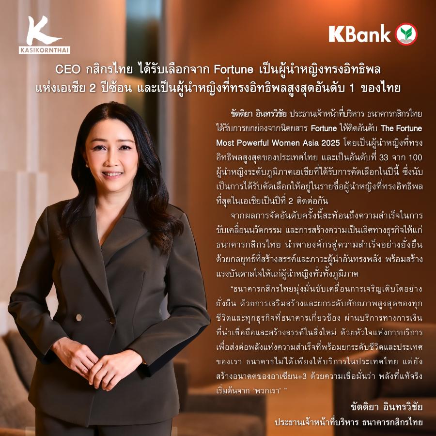 ขัตติยา อินทรวิชัย ประธานเจ้าหน้าที่บริหาร ธนาคารกสิกรไทย ได้รับการยกย่องจากนิตยสาร Fortune ให้ติดอันดับ The Fortune Most Powerful Women Asia 2025 โดยเป็นผู้นำหญิงที่ทรงอิทธิพลสูงสุดอันดับ 1 ของประเทศไทย และเป็นอันดับที่ 33 จาก 100 ผู้นำหญิงทรงอิทธิพลของภูมิภาคเอเชียที่ได้รับการคัดเลือกในปีนี้ ซึ่งเป็นการได้รับคัดเลือกให้อยู่ในรายชื่อผู้นำหญิงที่ทรงอิทธิพลที่สุดในเอเชียเป็นปีที่ 2 ติดต่อกัน