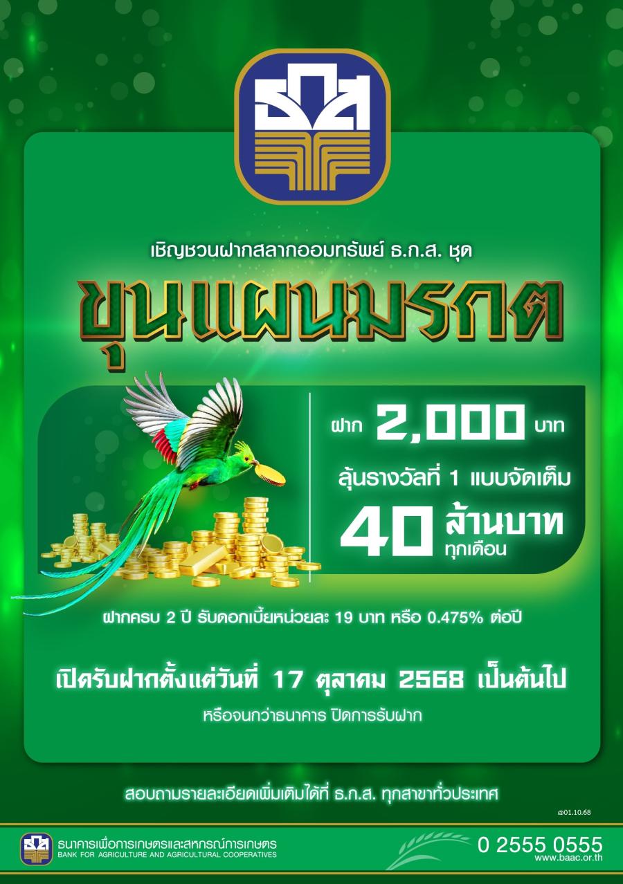ธ.ก.ส. เปิดตัว “สลากออมทรัพย์ ธ.ก.ส. ชุดขุนแผนมรกต” หน่วยละ 2000 บาท ลุ้นโชคใหญ่ทุกเดือน มูลค่า 40 ล้านบาท และรางวัลอื่น ๆ จำนวน 1 แสนรางวัล รวมมูลค่ากว่า 72 ล้านบาท ต่อเดือน ถึง 24 ครั้ง แบ่งเป็น 5 หมวด หมวดละ 10 ล้านหน่วย จำนวน 100000 ล้านบาท เมื่อฝากครบ 2 ปี ได้รับดอกเบี้ยทันทีหน่วยละ 19 บาท หรือคิดเป็น 0.475% และฝาก 1000 หน่วยขึ้นไป การันตีถูกรางวัลทุกงวด ดอกเบี้ยและเงินรางวัลสำหรับบุคคลธรรมดาได้รับการยกเว้นภาษี เปิดรับฝากวันที่ 17 ตุลาคมนี้ ผ่านแอปพลิเคชัน BAAC Mobile และ ธ.ก.ส. ทุกสาขา