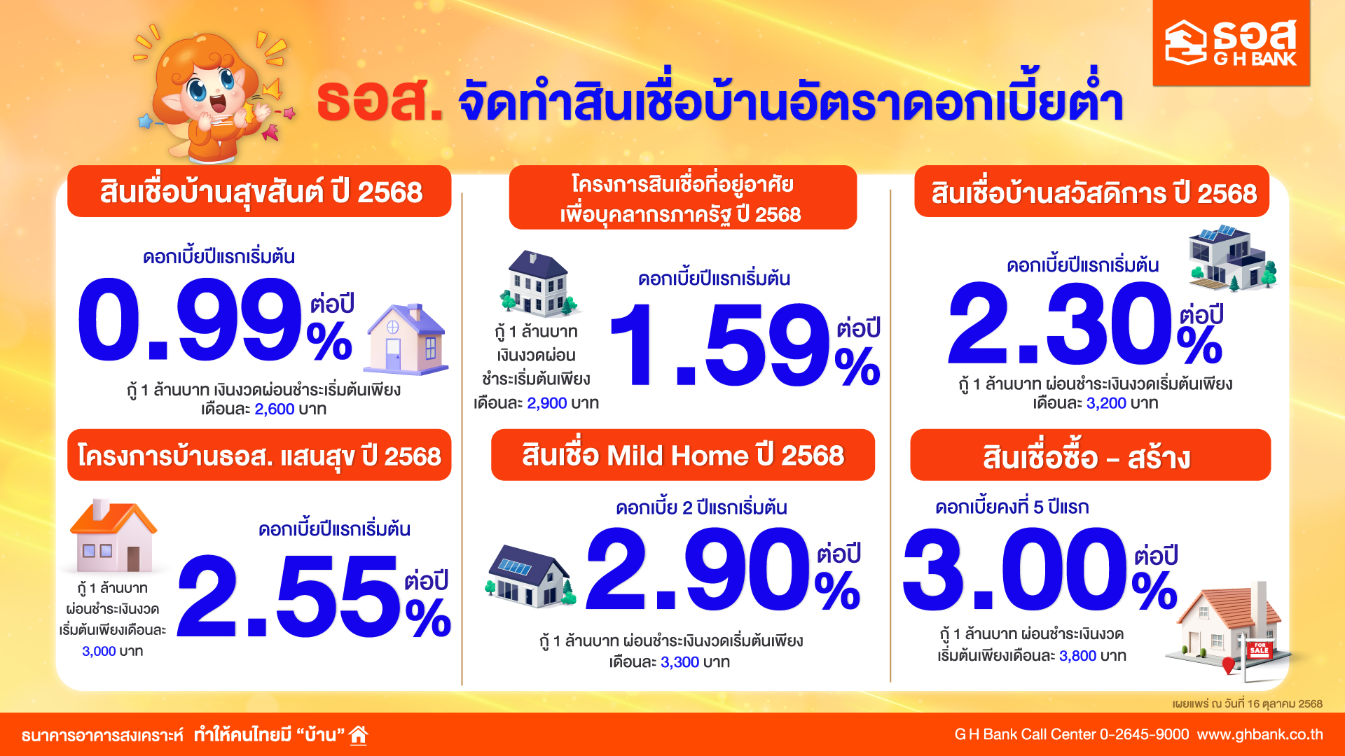 ธนาคารอาคารสงเคราะห์ (ธอส.) จัดทำโปรโมชันสินเชื่ออัตราดอกเบี้ยต่ำสนับสนุนคนไทยมีบ้านเป็นของตนเอง ส่งท้ายปี 2568 ดันเม็ดเงินลงสู่ภาคอสังหาริมทรัพย์ ส่งผลบวกต่อระบบเศรษฐกิจ ครอบคลุมทุกกลุ่มอาชีพ ลดภาระค่าครองชีพให้กับลูกค้าและประชาชน นำโดยสินเชื่ออัตราดอกเบี้ยเริ่มต้นเพียง 0.99% ต่อปี ผ่อนชำระนานสูงสุด 40 ปี กรณีกู้ 1 ล้านบาท เงินงวดผ่อนชำระเริ่มต้นเพียงเดือนละ 2600 บาท เท่านั้น! สนใจยื่นคำขอกู้ได้แล้วผ่าน Application : GHB ALL GEN และ ธอส. ทุกสาขาทั่วประเทศ