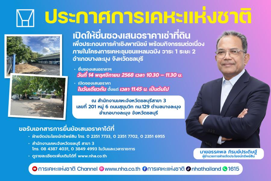 การเคหะแห่งชาติ เปิดโอกาสให้ผู้ประกอบการเช่าพื้นที่ระยะยาว 15 ปี เพื่อประกอบการค้าเชิงพาณิชย์ ภายในโครงการเคหะชุมชนแหลมฉบัง วาระ 1 ระยะ 2 ถนนเมืองใหม่ใต้ (แยกจากถนนสุขุมวิท กล.3) ตำบลบางละมุง อำเภอบางละมุง จังหวัดชลบุรี