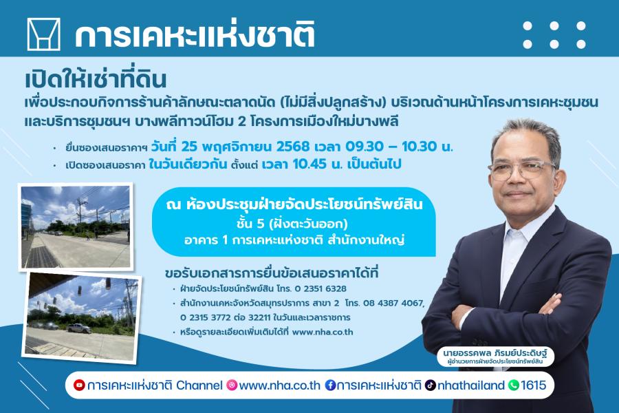 นายอรรคพล ภิรมย์ประดิษฐ์ ผู้อำนวยการฝ่ายจัดประโยชน์ทรัพย์สิน กล่าวว่า การเคหะแห่งชาติเปิดให้เอกชนยื่นข้อเสนอราคาการได้สิทธิเช่าที่ดิน เพื่อประกอบกิจการร้านค้าลักษณะตลาดนัด (ไม่มีสิ่งปลูกสร้าง) พร้อมกิจกรรมต่อเนื่อง บริเวณด้านหน้าโครงการเคหะชุมชนและบริการชุมชนฯ บางพลีทาวน์โฮม 2 ในโครงการเมืองใหม่บางพลี ขนาดเนื้อที่ประมาณ 2-2-6.8 ไร่ ตั้งอยู่บริเวณถนนเทพารักษ์ หมู่ที่ 6 ตำบลบางเสาธง อำเภอบางเสาธง จังหวัดสมุทรปราการ เพื่อให้เกิดความโปร่งใสในการดำเนินงานทุกขั้นตอนตามหลักธรรมาภิบาล การเคหะแห่งชาติจึงเปิดโอกาสให้เอกชนที่สนใจสามารถยื่นข้อเสนอราคาการได้สิทธิเช่าที่ดินดังกล่าว โดยมีอัตราค่าธรรมเนียมการได้สิทธิเช่าขั้นต่ำไม่น้อยกว่า 600000 บาท ระยะเวลาการให้สิทธิเช่า 3 ปี (ทำสัญญาคราวเดียว) ในอัตราค่าเช่ารายเดือน ปีที่ 1 เดือนละ 77200 บาท (ปลอดค่าเช่า 3 เดือนแรก) ปีที่ 2 เดือนละ 79600 บาท ปีที่ 3 เดือนละ 82000 บาท กำหนดหลักประกันการยื่นซองเสนอราคาจำนวน 100000 บาท กำหนดเงินประกันการปฏิบัติตามสัญญา จำนวน 3 เท่าของค่าเช่ารายเดือนปีสุดท้าย เป็นเงิน 246000 บาท โดยกำหนดวันยื่นข้อเสนอราคาฯ ในวันที่ 25 พฤศจิกายน 2568 เวลา 09.30 – 10.30 น. และกำหนดเปิดซองเสนอราคาในวันเดียวกัน ตั้งแต่เวลา 10.45 น. เป็นต้นไป ณ ห้องประชุมฝ่ายจัดประโยชน์ทรัพย์สิน ชั้น 5 (ฝั่งตะวันออก) อาคาร 1 การเคหะแห่งชาติ แขวงคลองจั่น เขตบางกะปิ กรุงเทพมหานคร