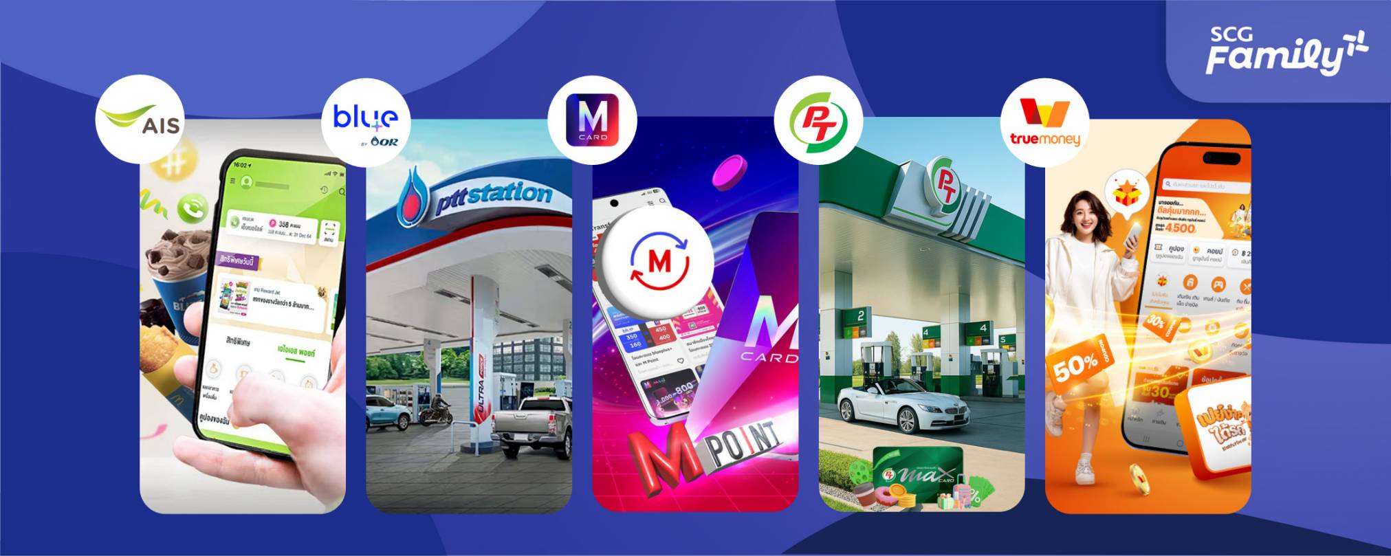 นอกจากนี้ SCG Family Plus ยังเป็นโปรแกรมที่เปิดกว้างสู่ความร่วมมือกับพันธมิตรแบรนด์ไทยชั้นนำ ได้แก่ AIS blueplus The Mall Group PTG และ TrueMoney เพื่อมอบสิทธิพิเศษที่หลากหลาย ครอบคลุมทั้งการเดินทาง ช้อปปิ้ง การสื่อสาร และพลังงาน