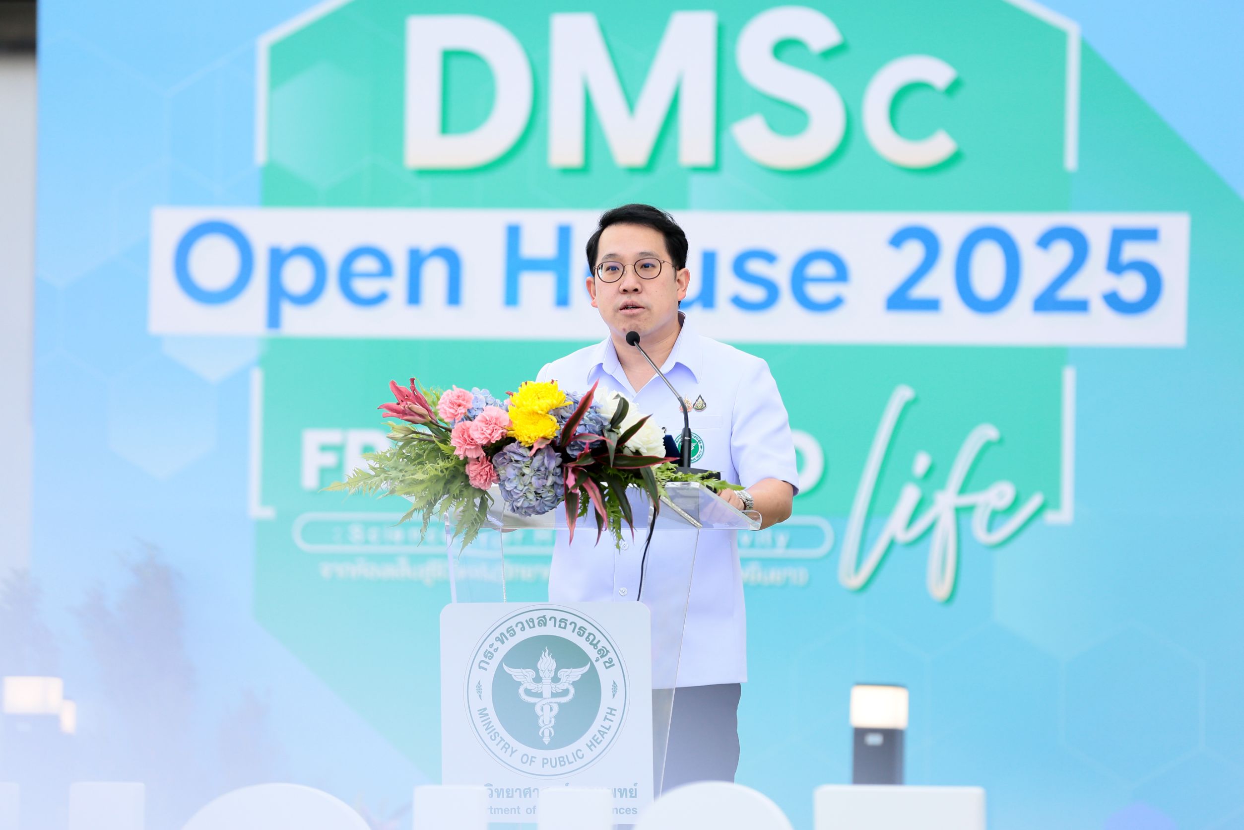 วันที่ 28 พฤศจิกายน 2568) นายพัฒนา พร้อมพัฒน์ รัฐมนตรีว่าการกระทรวงสาธารณสุข เป็นประธานพิธีเปิดงานสัมมนาเปิดบ้านกรมวิทยาศาสตร์การแพทย์ (DMSc Open House 2025) ภายใต้แนวคิด “From Lab to Life : Sciences for Healthy Longevity จากห้องแล็บสู่ชีวิตจริง วิทยาศาสตร์เพื่อการมีสุขภาพยืนยาว” โดยมี ดร.นพ.สราวุฒิ บุญสุข อธิบดีกรมวิทยาศาสตร์การแพทย์ ผู้บริหาร กระทรวงสาธารณสุข บุคลากรกรมวิทยาศาสตร์การแพทย์ ตลอดจนภาคีเครือข่ายภาครัฐและเอกชนร่วมงาน ณ บริเวณด้านหน้าอาคารศูนย์ผลิตภัณฑ์ยาเพื่อการบำบัดรักษาขั้นสูง (ATMPs) กรมวิทยาศาสตร์การแพทย์ กระทรวงสาธารณสุข จังหวัดนนทบุรี