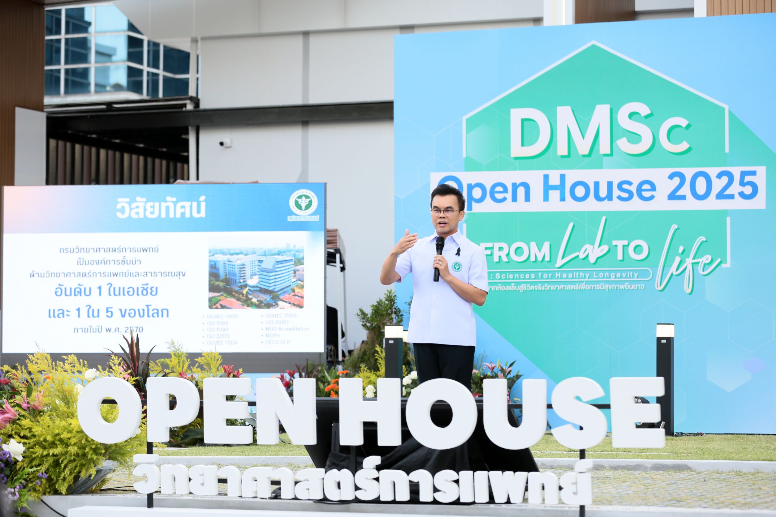 ดร.นพ.สราวุฒิ บุญสุข อธิบดีกรมวิทยาศาสตร์การแพทย์ กล่าวว่า งานเปิดบ้านกรมวิทยาศาสตร์การแพทย์ (DMSc Open House 2025) ในปีนี้ มีความพิเศษกว่าปีที่ผ่าน ๆ มา โดยการจัดกิจกรรมภายใต้แนวคิด “From Lab to Life : Sciences for Healthy Longevity จากห้องแล็บสู่ชีวิตจริงวิทยาศาสตร์เพื่อการมีสุขภาพยืนยาว” ซึ่งเป็นการแสดงถึงความพร้อมและศักยภาพของกรมวิทยาศาสตร์การแพทย์ในทุกมิติ และเพื่อประชาสัมพันธ์และเผยแพร่ความก้าวหน้าทางวิทยาศาสตร์การแพทย์ให้หน่วยงานที่เกี่ยวข้องได้รับทราบและเข้าใจบทบาทของกรมวิทยาศาสตร์การแพทย์ นวัตกรรมทางการแพทย์ ตลอดจนสร้างการรับรู้เกี่ยวกับวิทยาศาสตร์เพื่อสุขภาพยืนยาว โดยนำเสนอตัวอย่างการประยุกต์ใช้ผลงานจากห้องปฏิบัติการสู่การใช้งานจริง รวมถึงความก้าวหน้าทางวิทยาการและเทคโนโลยีด้านวิทยาศาสตร์การแพทย์ เพื่อประโยชน์ต่อประเทศชาติและประชาชน