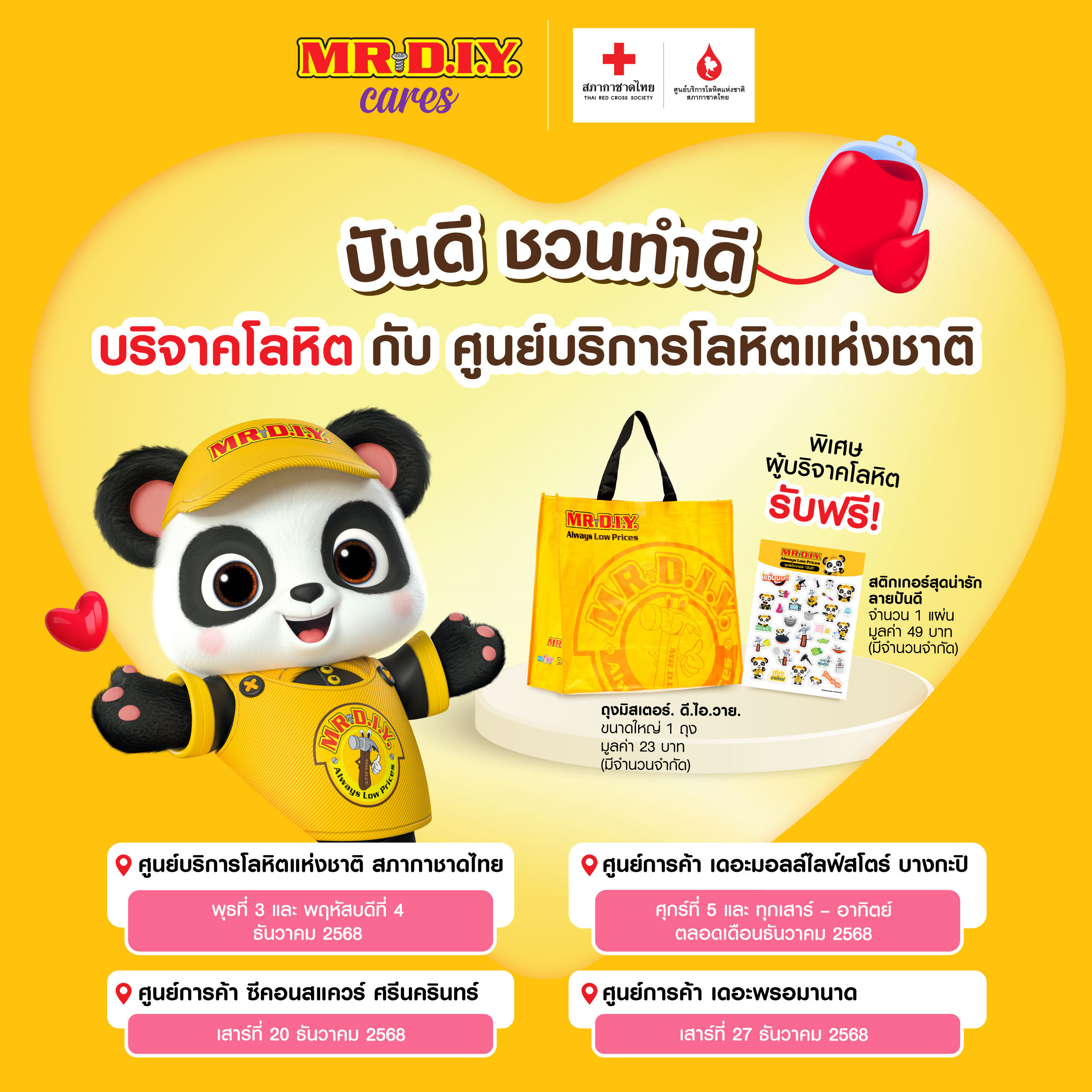 “ปันดี ชวนทำดีบริจาคโลหิต” ร่วมส่งต่อชีวิตในเทศกาลปีใหม่ตลอดต้นเดือนธันวาคมที่ผ่านมา มิสเตอร์. ดี.ไอ.วาย. ได้ร่วมสนับสนุนการบริจาคโลหิตกับสภากาชาดไทยในหลายพื้นที่ อาทิ ศูนย์บริการโลหิตแห่งชาติ หน่วยรับบริจาคประจำเดอะมอลล์ ไลฟ์สโตร์ บางกะปิ ซึ่งได้รับการตอบรับจากประชาชนเป็นอย่างดี โดยผู้สนใจยังสามารถร่วมบริจาคโลหิตได้อีก 2 จุดหลักในช่วงปลายเดือนธันวาคม ได้แก่ หน่วยรับบริจาคโลหิตเคลื่อนที่ ศูนย์การค้า ซีคอนสแควร์ ศรีนครินทร์ ในวันเสาร์ที่ 20 ธันวาคม 2568 และ หน่วยรับบริจาคโลหิตเคลื่อนที่ ศูนย์การค้าเดอะพรอมานาด ในวันเสาร์ที่ 27 ธันวาคม 2568 เพื่อเตรียมโลหิตสำรองช่วยผู้ป่วยในช่วงเทศกาลปีใหม่ ผู้ร่วมบริจาคโลหิตในเดือนธันวาคมนี้ยังจะได้รับของที่ระลึกจำนวนจำกัด ได้แก่ ถุงมิสเตอร์. ดี.ไอ.วาย. ขนาดใหญ่ (L) 1 ถุง และ สติกเกอร์ลายปันดี 1 แผ่น เพื่อเป็นกำลังใจแทนคำขอบคุณจากใจ