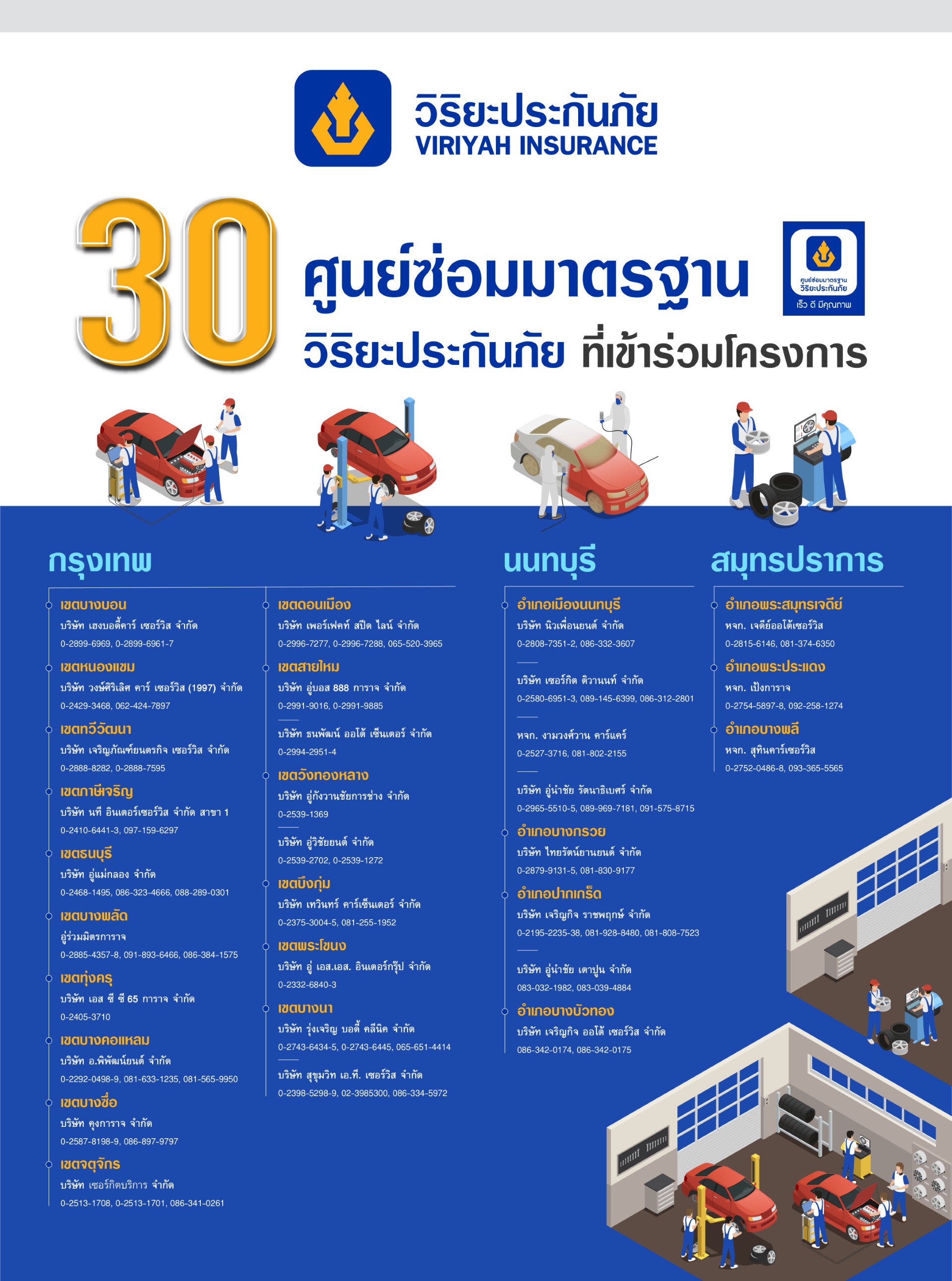 สำหรับศูนย์ซ่อมมาตรฐานวิริยะประกันภัยที่เข้าร่วมโครงการให้บริการตรวจรถฟรี จำนวน 30 แห่ง ได้แก่ 1) อู่ร่วมมิตรการาจ 2) บจ.นิวเพื่อนยนต์ 3) บจ.ไทยรัตน์ยานยนต์ 4) หจก. งามวงศ์วาน คาร์แคร์ 5) บจ.อู่นำชัย รัตนาธิเบศร์ 6) บจ.เซอร์กิต ติวานนท์ 7) บจ.อู่นำชัย เตาปูน (สาขาติวานนท์) 8) บจ.เจริญกิจ ราชพฤกษ์ 9) บจ.เจริญกิจ ออโต้ เซอร์วิส 10) บจ. คุงการาจ 11) บจ.เซอร์กิตบริการ 12) บจ.อู่กังวานชัยการช่าง 13) บจ.อู่วิชัยยนต์ 14) บจ.เทวินทร์ คาร์เซ็นเตอร์ 15) อู่บอส 888 การาจ 16) บจ.ธนพัฒน์ ออโต้ เซ็นเตอร์ 17) บจ.เพอร์เฟคท์ สปีด ไลน์ 18) บจ.เอส ซี ซี 65 การาจ 19) หจก. เจดีย์ออโต้เซอร์วิส 20) หจก.เป้งการาจ 21) บจ. อู่ เอส.เอส. อินเตอร์กรุ๊ป 22) บจ.รุ่งเจริญ บอดี้ คลีนิค 23) บจ.สุขุมวิท เอ.ที. เซอร์วิส 24) หจก.สุทินคาร์เซอร์วิส 25) บจ.เฮงบอดี้คาร์ เซอร์วิส 26) บจ.วงษ์ศิริเลิศ คาร์ เซอร์วิส (1997) 27) บจ.เจริญภัณฑ์ยนตรกิจ เซอร์วิส 28) บจ.นที อินเตอร์เซอร์วิส สาขา 1 29) บจ.อู่แม่กลอง 30) บจ.อ.พิพัฒน์ยนต์ (1989)