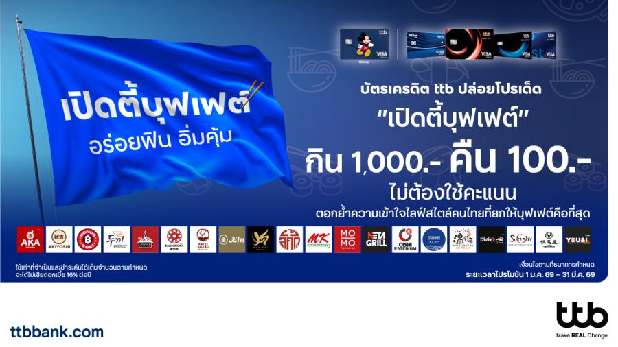 โดยมีร้านบุฟเฟต์ชื่อดังมากกว่า 50 ร้านทั่วประเทศ ครอบคลุมกลุ่มปิ้งย่าง ชาบู ซูชิ และบุฟเฟต์นานาชาติ เพื่อรองรับความหลากหลายของไลฟ์สไตล์ลูกค้าในทุกกลุ่ม อาทิ AKA Akiyoshi Kagonoya MK Restaurants Mo-Mo-Paradise / Mo-Mo-Paradise Gold Nene Grill Oishi Eaterium / Oishi Grand Shabushi You&I Premium Suki Buffet ที่พร้อมมอบความคุ้มค่าให้ลูกค้าบัตรเครดิต ttb รับเครดิตเงินคืนทันที 100 บาท เมื่อใช้จ่ายครบ 1000 บาท / เซลล์สลิป แบบไม่ต้องแลกคะแนน และรับเงินคืนสูงสุด 400 บาท / ท่านตลอดรายการ ตั้งแต่วันที่ 1 มกราคม 2569 – 31 มีนาคม 2569 ลูกค้าสามารถลงทะเบียนเพียงครั้งเดียวผ่านแอป ttb touch เพื่อรับสิทธิ์ตลอดระยะเวลาแคมเปญ ศึกษารายละเอียดเพิ่มเติมของแคมเปญและรายชื่อร้านอาหารที่ร่วมรายการ ได้ที่ https://www.ttbbank.com/link/fbweb-buffet-jan26