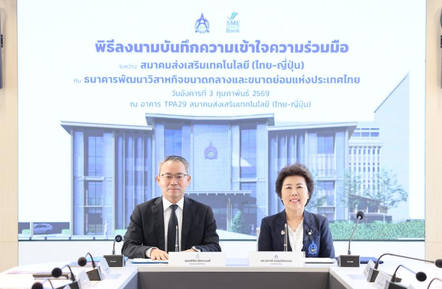 ธนาคารพัฒนาวิสาหกิจขนาดกลางและขนาดย่อมแห่งประเทศไทย (ธพว.) หรือ SME D Bank โดย นายพิชิต มิทราวงศ์ กรรมการผู้จัดการ และ สมาคมส่งเสริมเทคโนโลยี (ไทย-ญี่ปุ่น) หรือ ส.ส.ท. โดย รองศาสตราจารย์ ปราณี จงสุจริตธรรม นายก ส.ส.ท. ร่วมลงนามบันทึกข้อตกลงความร่วมมือ “การพัฒนาและสนับสนุนผู้ประกอบการเพื่อยกระดับศักยภาพ SMEs” เพื่อส่งเสริมผู้ประกอบการเอสเอ็มอี นำเทคโนโลยีและนวัตกรรม มาประยุกต์ใช้ต่อยอดธุรกิจ สร้างการเติบโตอย่างยั่งยืน พร้อมก้าวสู่อุตสาหกรรมแห่งอนาคต ณ ห้องประชุม Board Room ชั้น 3 อาคารสมาคมส่งเสริมเทคโนโลยี (ไทย-ญี่ปุ่น)