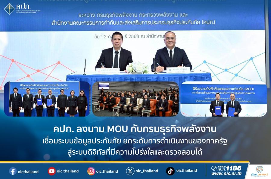 คปภ. ลงนาม MOU กับกรมธุรกิจพลังงาน เชื่อมระบบข้อมูลประกันภัย ยกระดับการดำเนินงานของภาครัฐสู่ระบบดิจิทัลที่มีความโปร่งใสและตรวจสอบได้