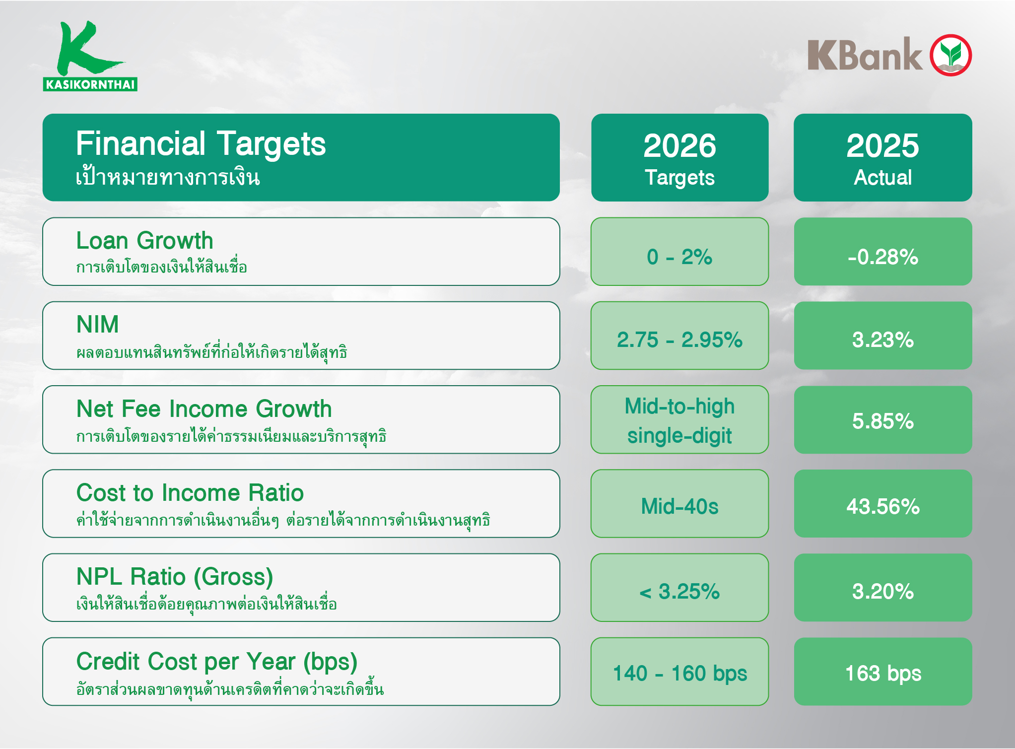 · อัตราส่วนผลขาดทุนด้านเครดิตที่คาดว่าจะเกิดขึ้น (Credit Cost): อยู่ที่ในช่วง 140-160 bps (Normalized Level) โดยธนาคารยังคงบริหารความเสี่ยงที่รอบคอบและระมัดระวังสอดคล้องกับสภาวะเศรษฐกิจ อีกทั้ง ธนาคารยังคงมีสถานะเงินกองทุนที่แข็งแกร่งเพียงพอรองรับการดำเนินธุรกิจอย่างต่อเนื่อง