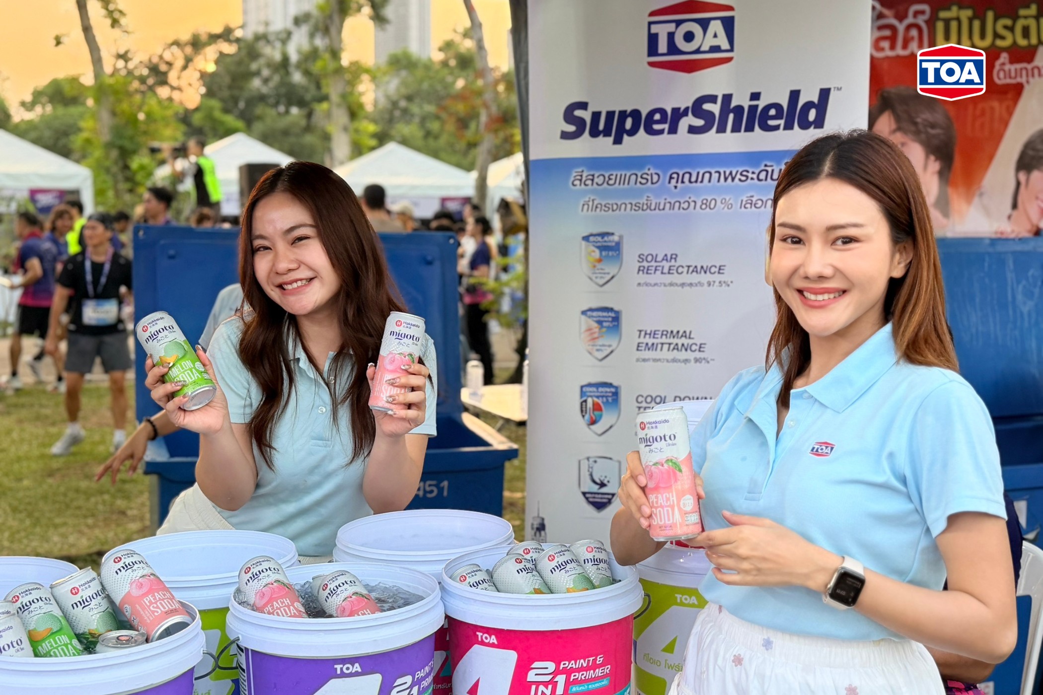 นอกจากความอิ่มบุญแล้ว TOA ยังได้ร่วมออกบูธกิจกรรมเพื่อเติมพลังความสดชื่นให้แก่นักวิ่งและผู้ร่วมงาน ด้วยเครื่องดื่ม “ฮอกไกโด มิโกโตะ” (Hokkaido Migoto) เครื่องดื่มโซดาสไตล์ญี่ปุ่นระดับพรีเมียม ทั้งกลิ่นเมลอนและกลิ่นพีช ซึ่งเป็นสูตรปราศจากน้ำตาล (Zero Sugar) แคลอรี่ต่ำ สอดรับกับเทรนด์การดูแลสุขภาพของคนรุ่นใหม่และบรรยากาศการออกกำลังกายที่ใส่ใจสิ่งแวดล้อม