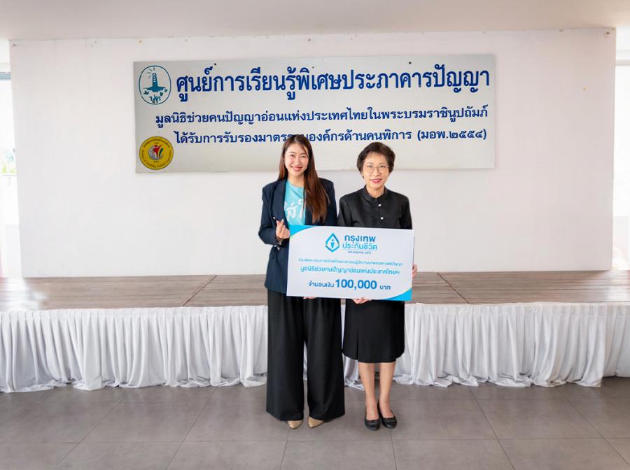 บริษัท กรุงเทพประกันชีวิต จำกัด (มหาชน) เดินหน้าสานต่อภารกิจด้านความรับผิดชอบต่อสังคม (CSR) ด้วยการส่งต่อ “พลังของความใส่ใจ” ในเดือนแห่งความรัก โดยมุ่งยกระดับคุณภาพชีวิต ของกลุ่มเปราะบางในสังคม ผ่านการสนับสนุนด้านการศึกษาและการพัฒนาศักยภาพอย่างยั่งยืน โดย นางสาวศริฐณี ศิริสมบูรณ์ ผู้จัดการอาวุโส ส่วนงานประชาสัมพันธ์และกิจกรรมเพื่อสังคม (ซ้าย) เป็นผู้แทนบริษัทฯ มอบเงินสนับสนุนจำนวน 100000 บาท ให้แก่ “ศูนย์การเรียนรู้พิเศษประภาคารปัญญา” ในสังกัดมูลนิธิช่วยคนปัญญาอ่อนแห่งประเทศไทย ในพระบรมราชินูปถัมภ์ เพื่อส่งเสริมโอกาสในการเรียนรู้และพัฒนาคุณภาพชีวิตของผู้มีความบกพร่องทางสติปัญญา โดยมี นางกาญจนา ภัทราพรนันท์ ผู้อำนวยการศูนย์การเรียนรู้พิเศษประภาคารปัญญา (ขวา) เป็นผู้รับมอบ ณ ศูนย์การเรียนรู้พิเศษประภาคารปัญญา แขวงฉิมพลี เขตตลิ่งชัน กรุงเทพฯ