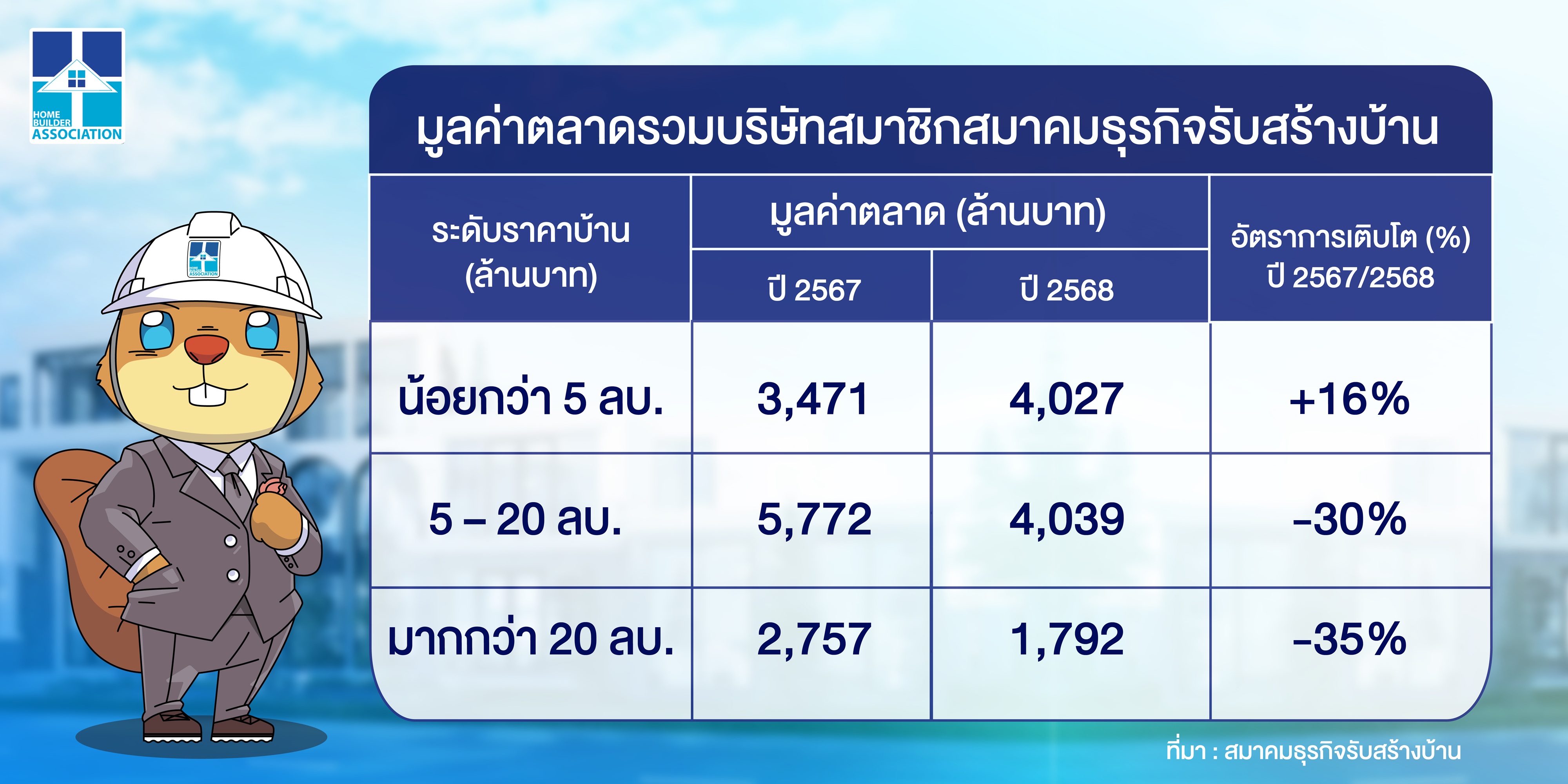 เจาะลึกยอดสั่งสร้างบ้าน สมาชิกสมาคมธุรกิจรับสร้างบ้านทั่วประเทศปี 2568 และคาดการณ์ปี 2569 ตลาดธุรกิจรับสร้างบ้าน Real Demand ยังแข็งแกร่ง บ้านต่ำกว่า 5 ล้านบาท เติบโต 16% สวนทางตลาดบ้านหรูหดตัว 35% แจงผลงานจัดตั้ง ‘คณะอนุกรรมการชั่วคราวภาคอีสานและภาคใต้’ สำเร็จแล้ว เร่งเดินหน้าจัดงานมหกรรมรับสร้างบ้าน กระตุ้นกำลังซื้อท้องถิ่นภายในปีนี้ มั่นใจตอกย้ำความเชื่อมั่นผู้บริโภค สร้างบ้านดีไม่ทิ้งงาน เตรียมชง ‘ครม.ชุดใหม่’ ดันมาตรการลดหย่อนภาษีสร้างบ้าน สินเชื่อดอกเบี้ยต่ำ ฟื้นกำลังซื้ออย่างเป็นรูปธรรม เผยสร้างบ้านวันนี้คุ้มสุด ‘โอกาสทองของผู้บริโภค’ สร้างบ้านราคาเดิม ก่อนต้นทุนขยับรับเศรษฐกิจฟื้นตัว