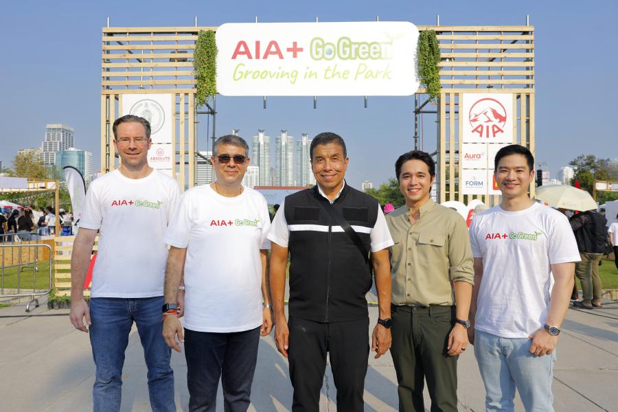 เอไอเอ ประเทศไทย นำโดย นายนิคฮิล แอดวานี ประธานเจ้าหน้าที่บริหาร (สองจากซ้าย) ดร. คริสเตียน โรแลนด์ ประธานเจ้าหน้าที่ฝ่ายกลยุทธ์และดิจิทัล (ซ้าย) และ นายจุฑาภัทร เหล่าธรรมทัศน์ ผู้อำนวยการฝ่ายพัฒนา ดิจิทัล โซลูชันส์ แอนด์ ดีไซน์ เอไอเอ เวลเนส (ขวา) พร้อมด้วย นายชัชชาติ สิทธิพันธุ์ ผู้ว่าราชการกรุงเทพมหานคร (กลาง) และ นายอเล็กซ์ เรนเดลล์ ประธานกรรมการบริหาร ศูนย์สิ่งแวดล้อมศึกษา (EEC) (สองจากขวา) ร่วมเปิดงาน AIA Go Green Festival – Grooving in the Park เฉลิมฉลองความสำเร็จในพันธกิจการดูแลสุขภาพ ควบคู่การขับเคลื่อนสังคมสู่ความยั่งยืน ณ สวนเบญจกิติ