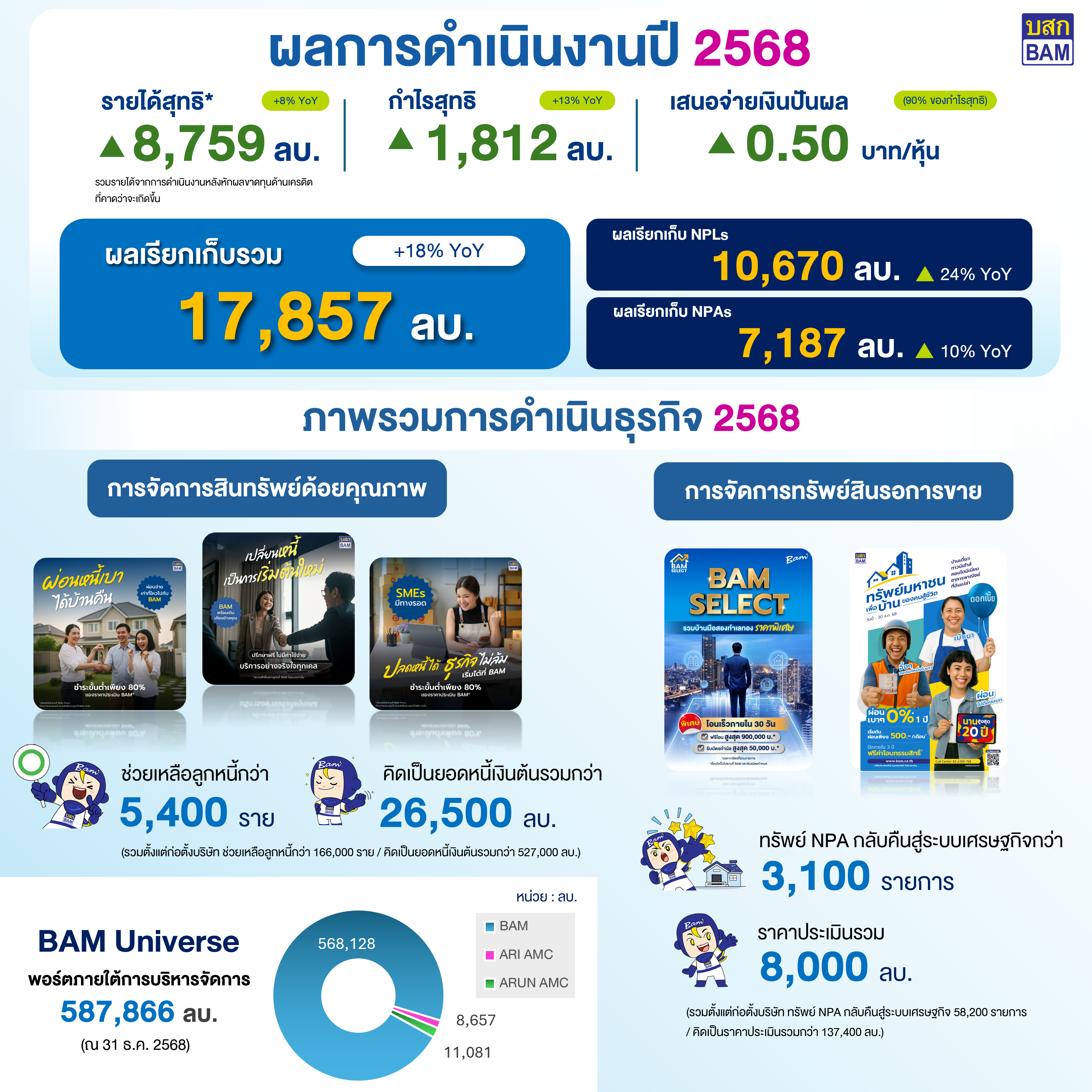 ทั้งนี้ ในปี 2568 บริษัท ฯ สามารถดำเนินภารกิจหลักในการประนอมหนี้และบริหารจัดการทรัพย์สินด้อยคุณภาพกลับคืนสู่ระบบเศรษฐกิจได้อย่างมีประสิทธิภาพ โดยให้ความช่วยเหลือลูกหนี้จำนวนกว่า 5400 ราย คิดเป็นยอดเงินต้นรวมกว่า 26500 ล้านบาท พร้อมทั้งจำหน่ายทรัพย์สินได้กว่า 3100 รายการ มูลค่ารวมกว่า 8000 ล้านบาท ขณะเดียวกันบริษัทฯ ยังได้ขยายขอบเขตการดำเนินธุรกิจผ่านรูปแบบความร่วมมือเชิงกลยุทธ์ในลักษณะ Joint Venture (JV Model) ภายใต้แนวคิด “BAM Universe” ส่งผลให้ปัจจุบันมีพอร์ตสินทรัพย์ภายใต้การบริหารจัดการรวมทั้งสิ้น 587866 ล้านบาท อย่างไรก็ตาม บริษัทฯ ยังคงมุ่งมั่นดำเนินธุรกิจตามหลักธรรมาภิบาล โปร่งใส และคำนึงถึงผู้มีส่วนได้เสียทุกภาคส่วน ควบคู่กับการสร้างการเติบโตอย่างยั่งยืนในระยะยาว เพื่อเสริมสร้างความแข็งแกร่งให้กับองค์กรและระบบเศรษฐกิจไทยโดยรวม