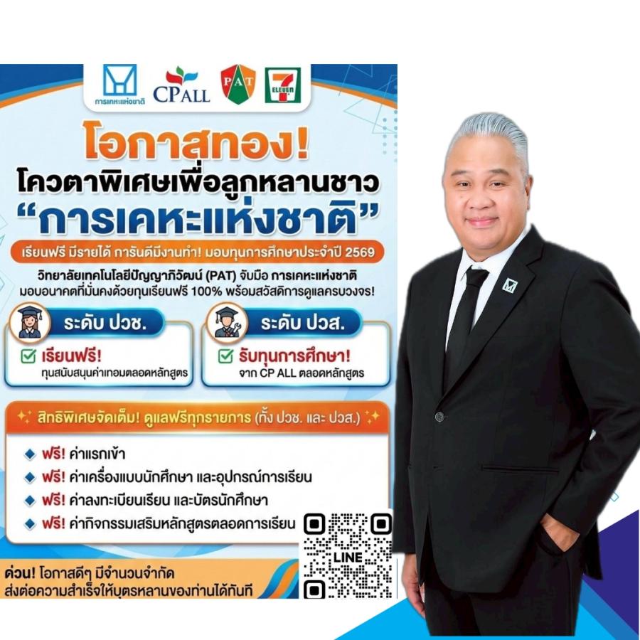 การเคหะแห่งชาติ หนุนการศึกษาเยาวชนจับมือ CP ALL และวิทยาลัยเทคโนโลยีปัญญาภิวัฒน์ มอบทุนการศึกษาหลักสูตร ปวช. และ ปวส. ประจำปีการศึกษา 2569 ให้แก่เยาวชนในชุมชนการเคหะแห่งชาติได้เรียนฟรีตลอดหลักสูตร พร้อมสวัสดิการมีรายได้ระหว่างเรียน สร้างโอกาสสู่การมีงานทำและอนาคตที่มั่นคง