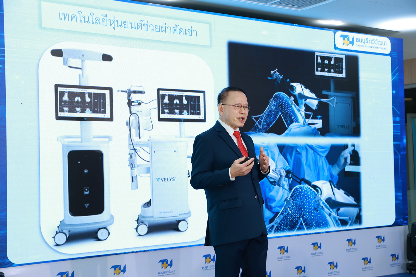 ภายในงานแถลงข่าว รศ. พท. นพ. บุระ สินธุภากร ศัลยแพทย์เฉพาะทางด้านศัลยศาสตร์ออร์โธปิดิกส์ ข้อสะโพกและข้อเข่า โรงพยาบาลธนบุรี ทวีวัฒนา ได้ร่วมเจาะลึกในหัวข้อ “Advanced Care ยกระดับมาตรฐานการรักษาด้วยเทคโนโลยี AI” โดยระบุว่า ปัญญาประดิษฐ์ (AI) ได้เข้ามาพลิกโฉมการผ่าตัดในฐานะผู้ช่วยอัจฉริยะ ที่สามารถวิเคราะห์โครงสร้างทางชีวกลศาสตร์ (Biomechanics) ของผู้ป่วยได้อย่างละเอียด ระบบจะประมวลผลข้อมูลกายวิภาคแบบเรียลไทม์ เพื่อคำนวณพิกัดการวางข้อเทียมด้วยความแม่นยำระดับมิลลิเมตร ช่วยลดความคลาดเคลื่อน (Human Error) ได้อย่างมีประสิทธิภาพ นอกจากนี้นวัตกรรมหุ่นยนต์ช่วยผ่าตัดฯ ยังช่วยปรับสมดุลความตึงของเส้นเอ็นรอบข้อเข่าในทุกองศาการงอ ซึ่งการวางแผนผ่าตัดแบบเฉพาะบุคคล (Personalized Surgical Plan) นี้ ยังช่วยยืดอายุการใช้งานของข้อเทียมให้ยาวนานขึ้น