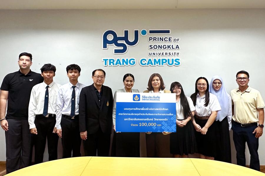 ผศ. ดร.ปาริชาติ มณีมัย คณบดีคณะพาณิชยศาสตร์และการจัดการ มหาวิทยาลัยสงขลานครินทร์ วิทยาเขตตรัง รับมอบทุนการศึกษา มูลค่า 100000 บาท จากบริษัท วิริยะประกันภัย จำกัด (มหาชน) โดยมี นางเสาวคนธ์ วงศ์กองแสง ผู้จัดการฝ่ายปฏิบัติการภาค 5 (ภาคใต้) ด้านสาขา เป็นผู้แทนมอบ เพื่อส่งเสริมโอกาสทางการศึกษาให้แก่นักศึกษาชั้นปีที่ 1 ในหลักสูตรด้านประกันภัยและการจัดการความเสี่ยง สาขาการบริหารธุรกิจประกันภัยและการจัดการความเสี่ยง สามารถพัฒนาศักยภาพการเรียนรู้ของตนเองได้อย่างมีประสิทธิภาพ โดยมี ผศ. ดร.พงษ์พิช เพชรสกุลวงศ์ ประธานหลักสูตรบริหารธุรกิจบัณฑิต สาขาการบริหารธุรกิจประกันภัยและการจัดการความเสี่ยง และผศ. ดร.ณรงค์ฤทธิ์ ปริสุทธิ์กุล ผู้ช่วยอธิการบดีฝ่ายวิชาการและวิจัย ร่วมเป็นเกียรติในพิธีมอบ ณ ห้องประชุม MBA มหาวิทยาลัยสงขลานครินทร์ วิทยาเขตตรัง